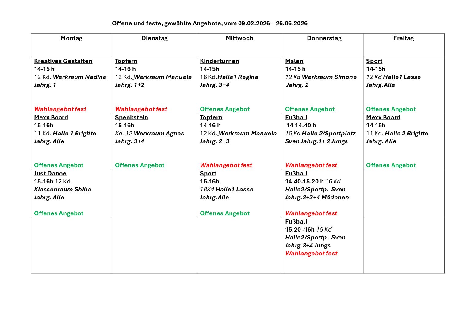 Offene und feste Angebote für das 2. Schulhalbjahr 2025/2026, vom 09.02.2025 – 26.06.2026.